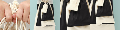 Stuff bag. Double drawcord closure. Natural pull ties. Certified 150gsm organic cotton.